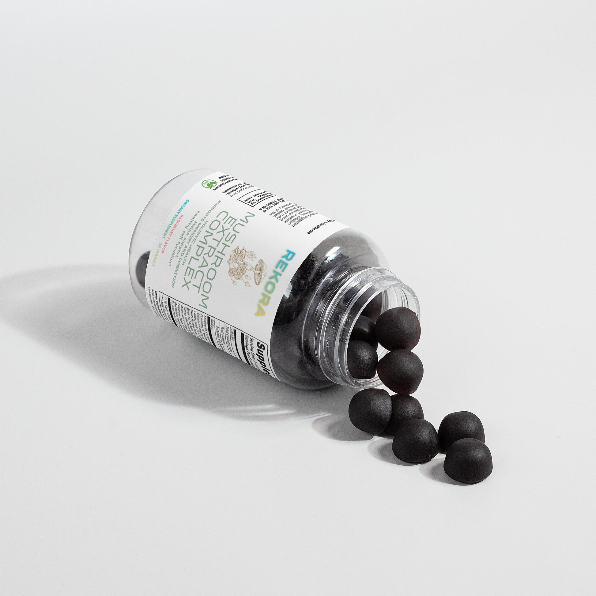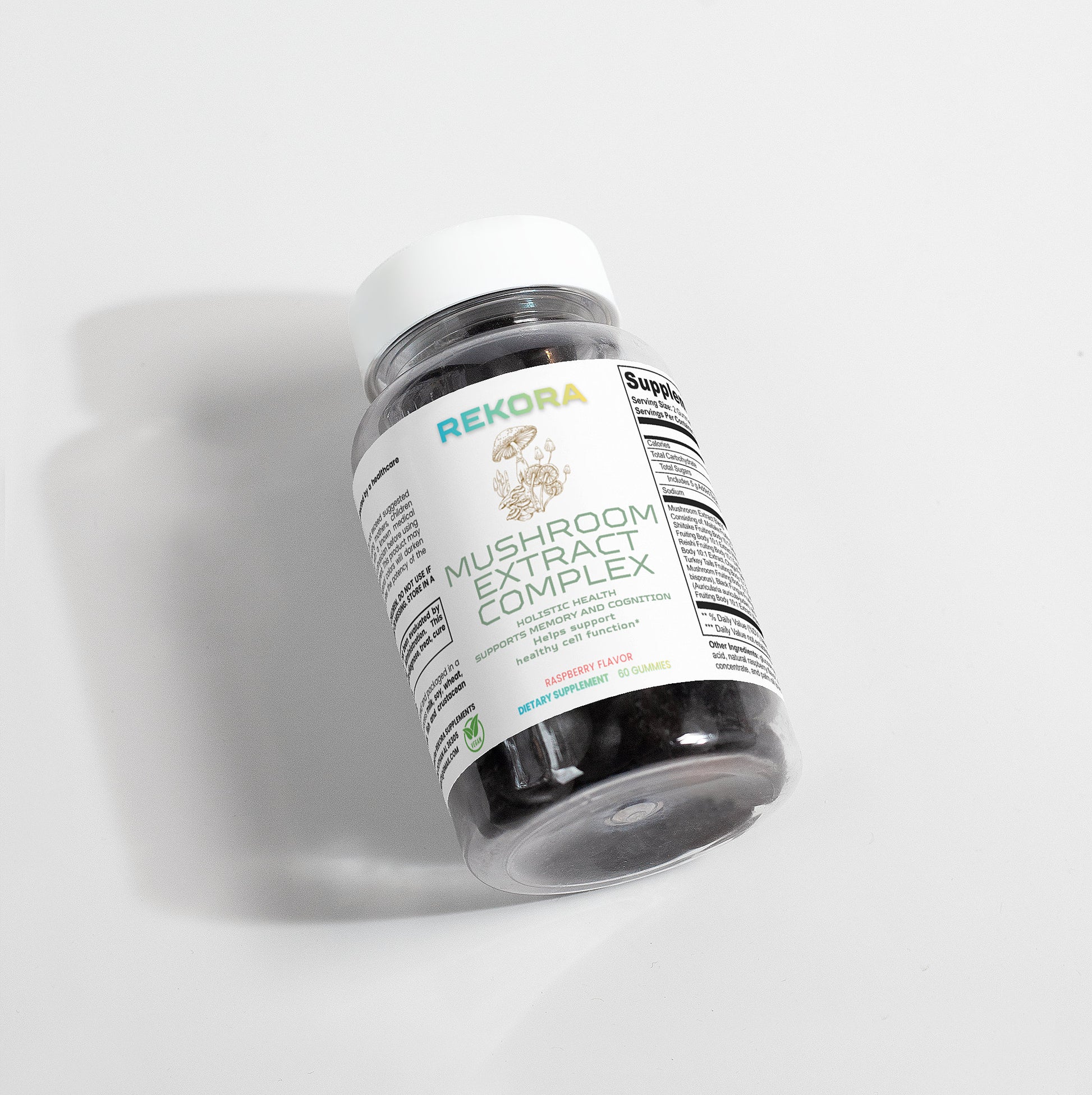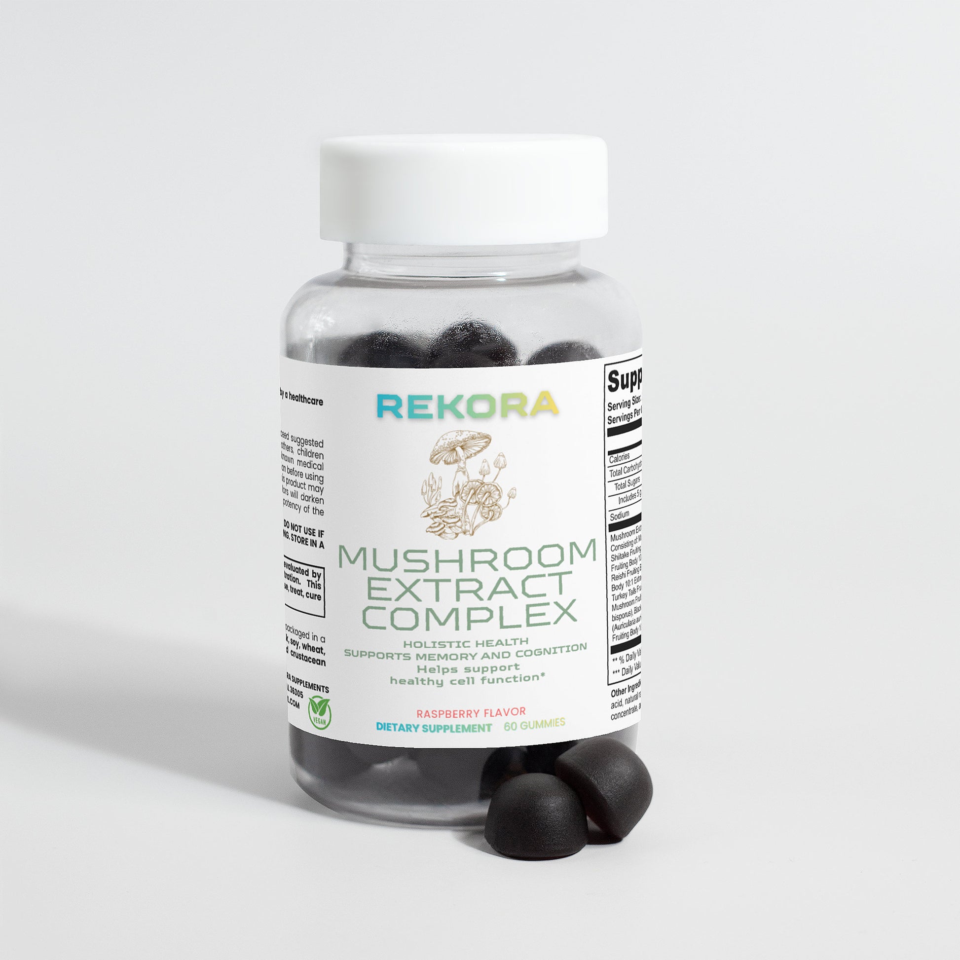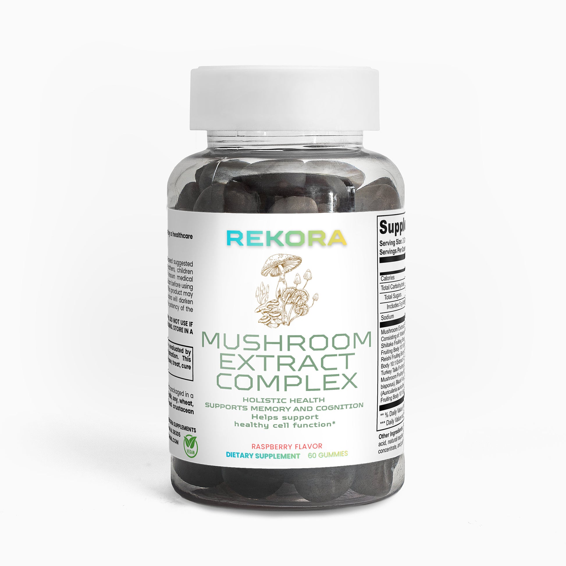 Ingredients: Mushroom extract (Maitake Fruiting Body 10:1 Extract, Shiitake Fruiting Body 10: 1 Extract, Lion’s Mane Fruiting Body 10:1 Extract, Reishi Fruiting Body 10:1 Extract, Cordyceps Fruiting Body 10:1 Extract, Chaga Fruiting Body 10:1 Extract, Turkey Tails Fruiting Body 10:1 Extract, White Button Mushroom Fruiting Body 10:1 Extract, Black Fungus Fruiting Body 10:1 Extract, Royal Sun Mushroom Fruiting Body 10:1 Extract), glucose syrup, sugar, dextrose, pectin, citric acid, natural raspberry flavor, sodium citrate, purple carrot juice concentrate, palm oil (contains carnauba wax).
